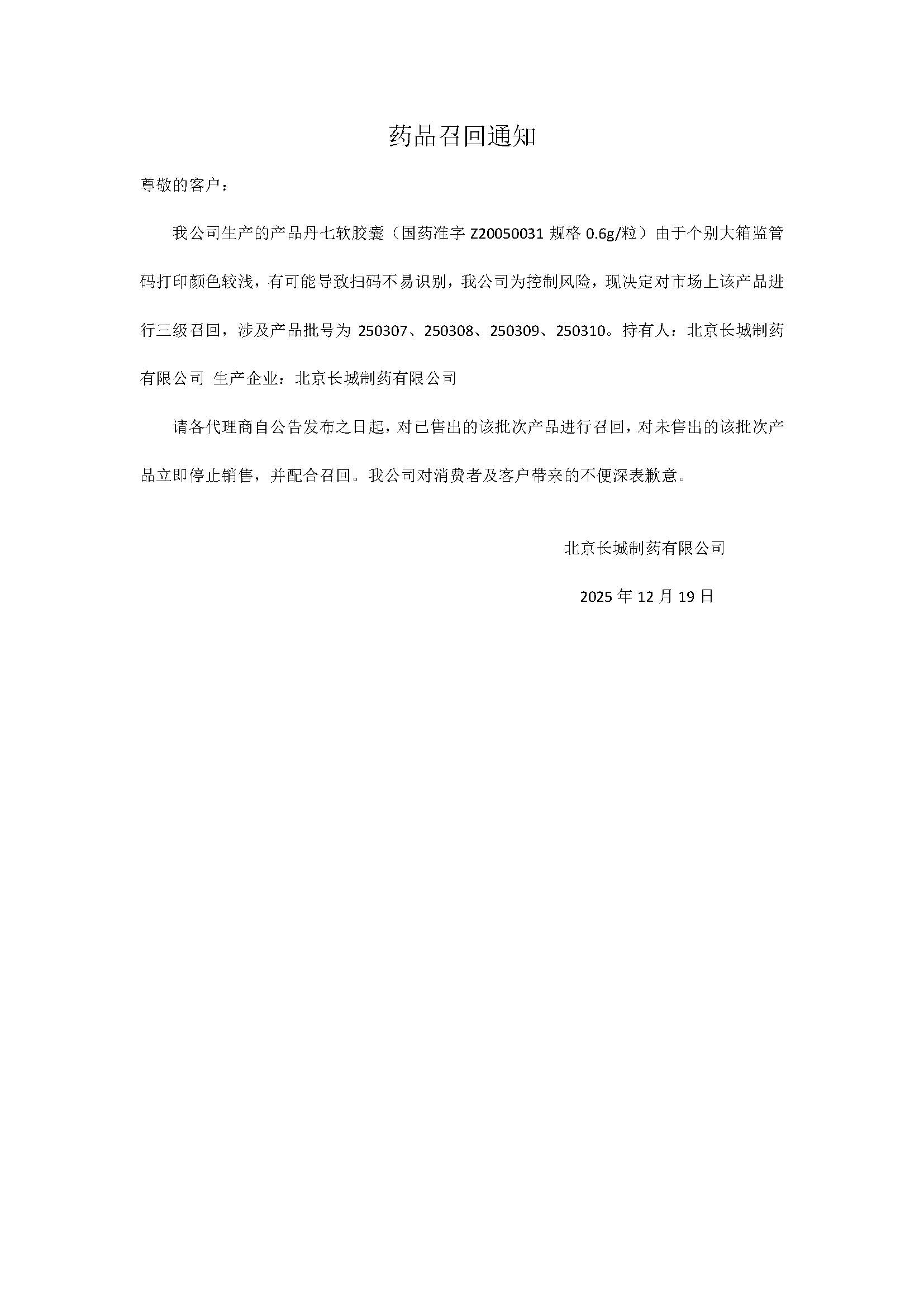药品召回通知-丹七软胶囊
