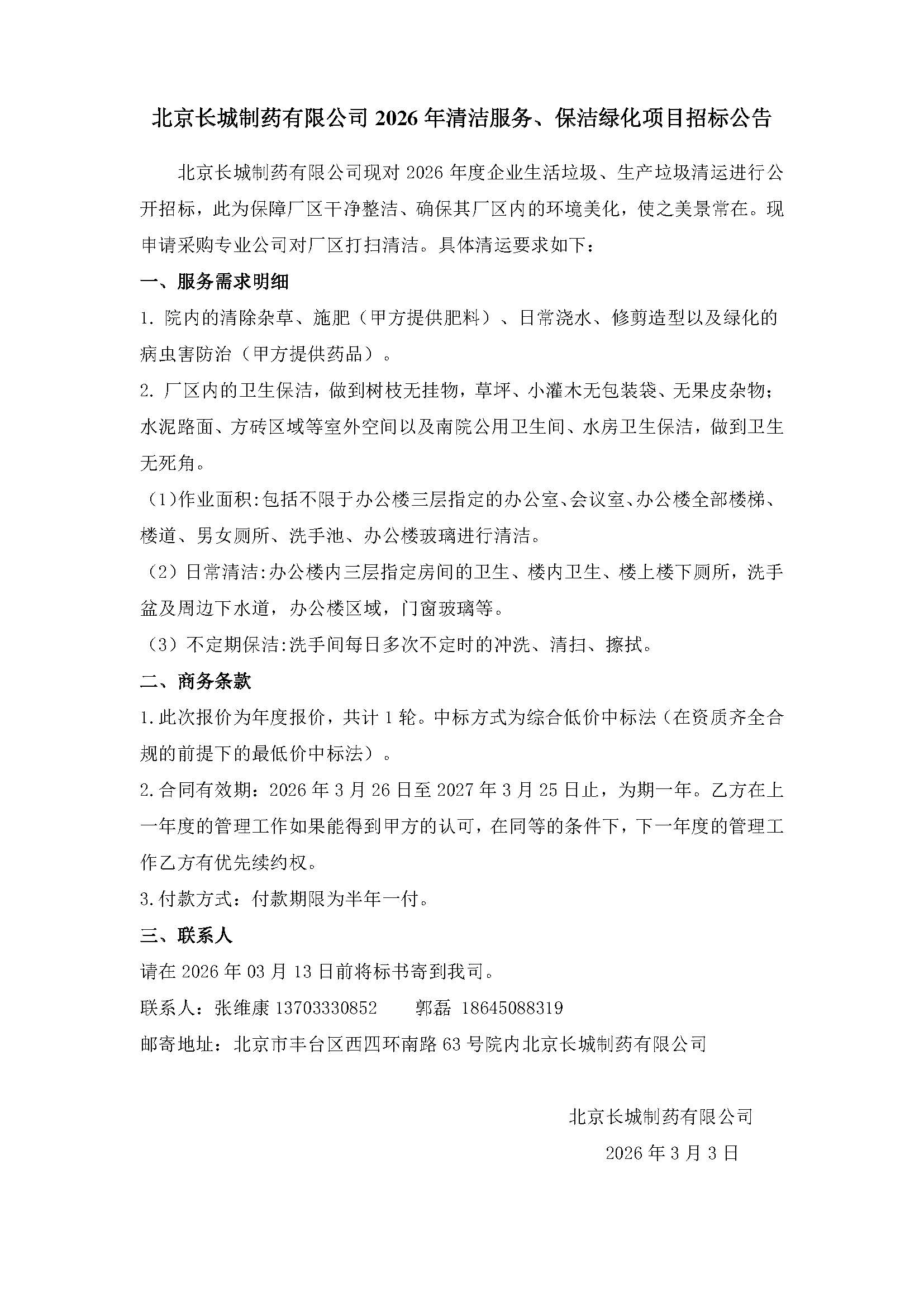 北京长城制药有限公司2026年清洁服务、保洁绿化项目招标公告
