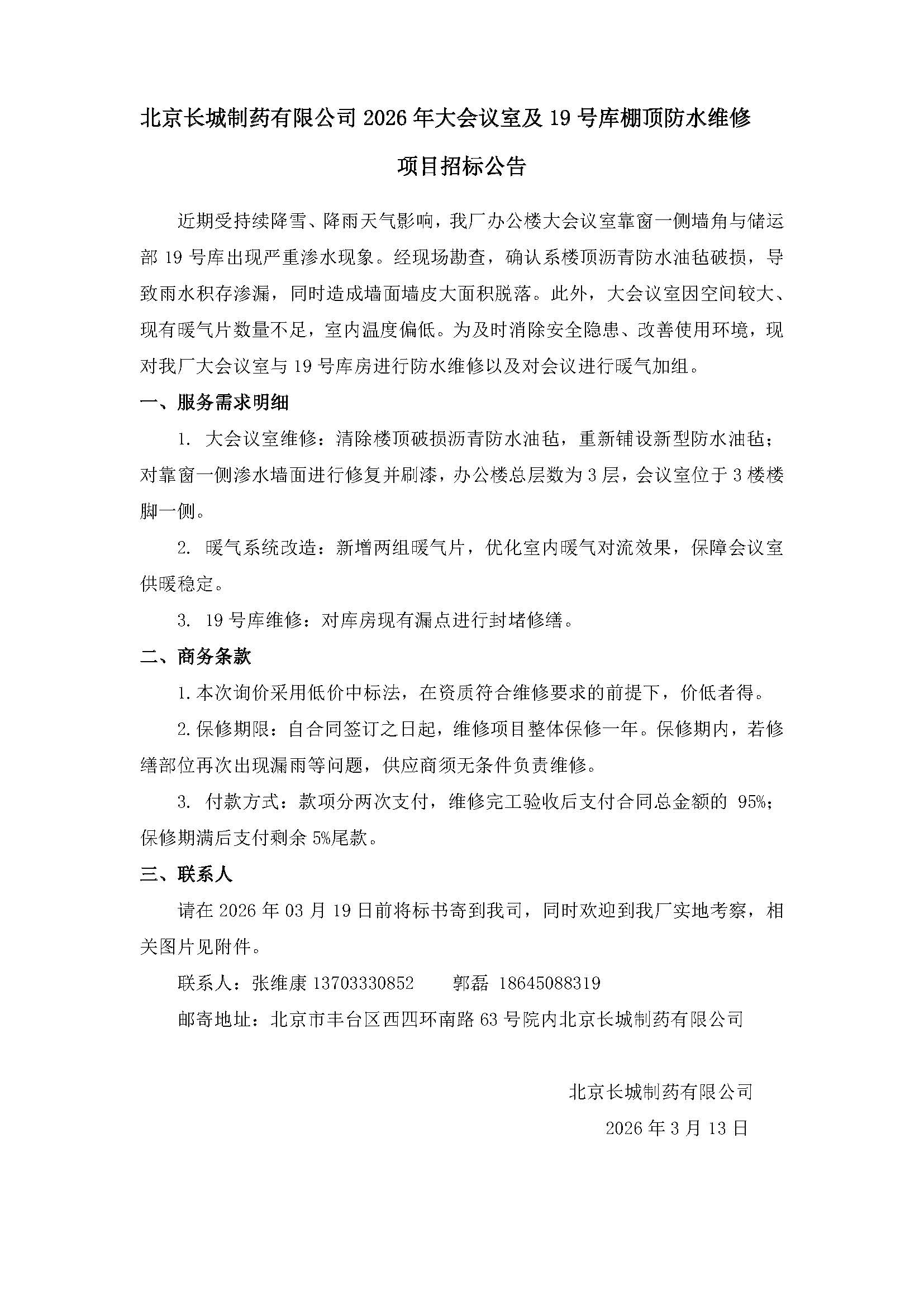 北京长城制药有限公司2026年大会议室及19号库棚顶防水维修 项目招标公告
