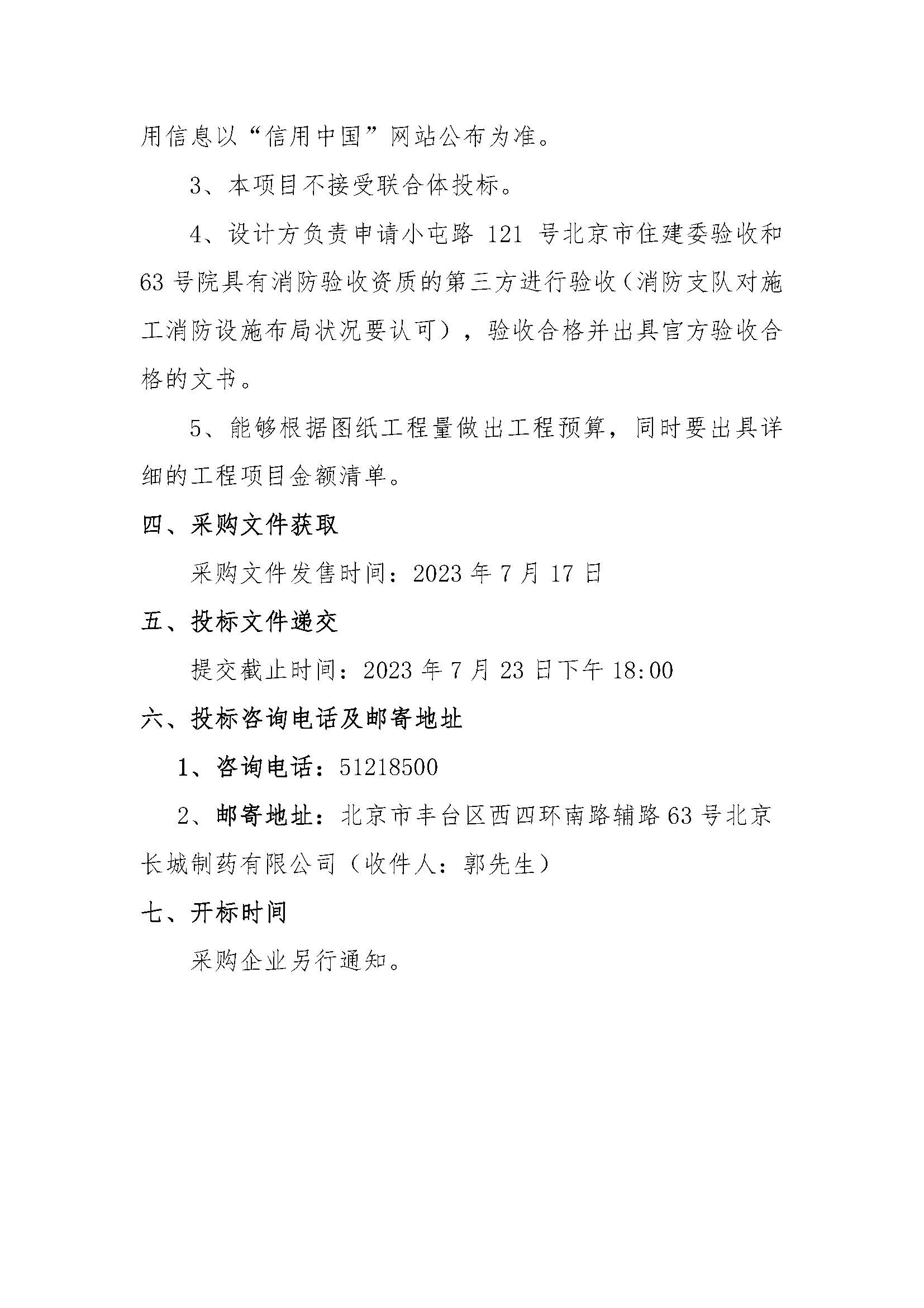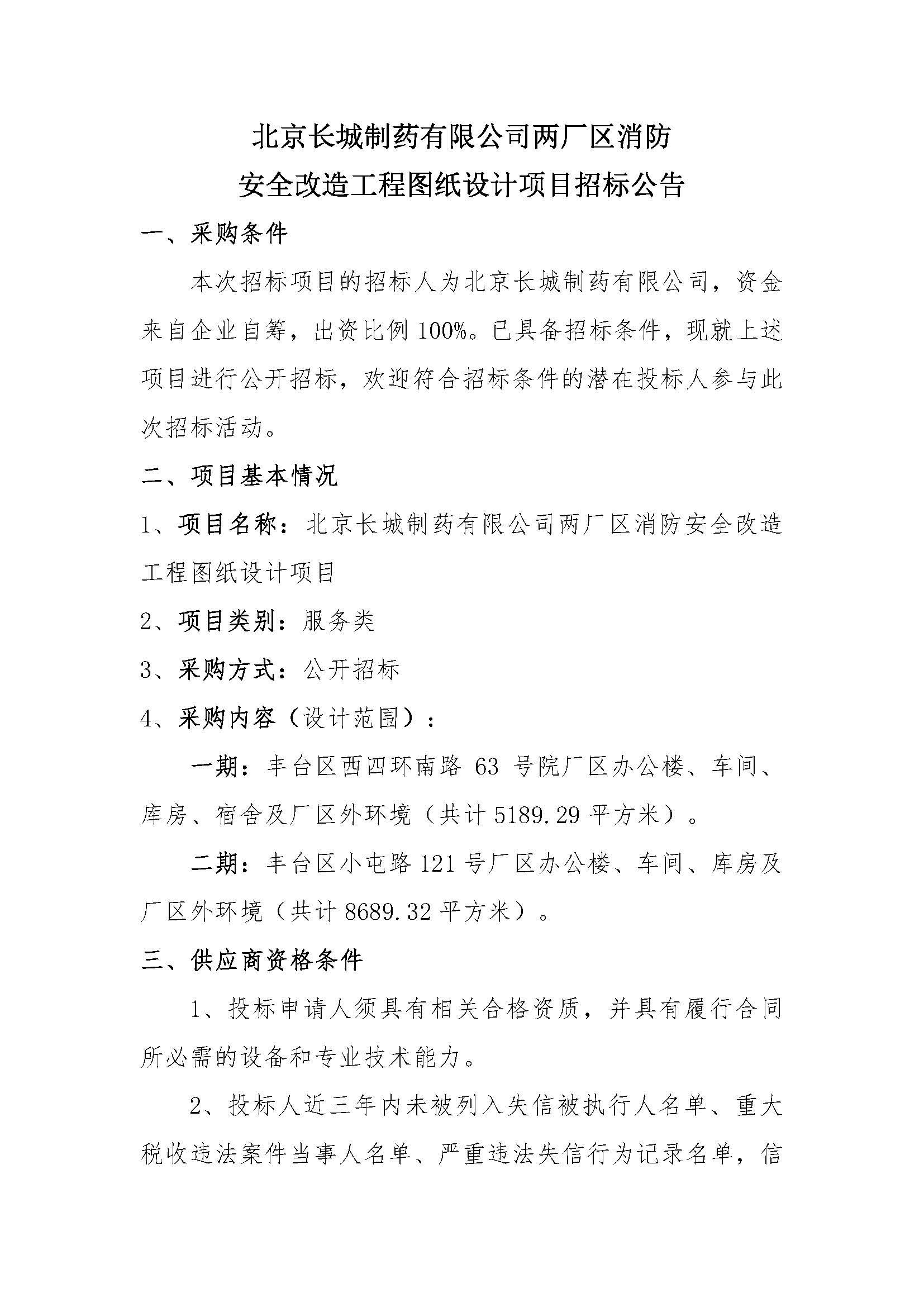 北京长城制药有限公司两厂区消防安全改造工程图纸设计项目招标公告